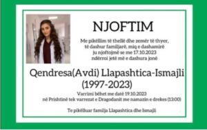 Nëna 26-vjeçare është diagonstikuar me leukemi, ka nevojë për ndihmë “Me pikëllim të thellë dhe zemër të thyer, të dashur familjarë, miq e dashamirë ju njoftojmë se me 17.10.2023 ndërroi jetë më e dashura jonë, Qendresa Llapshtica-Ismajli.